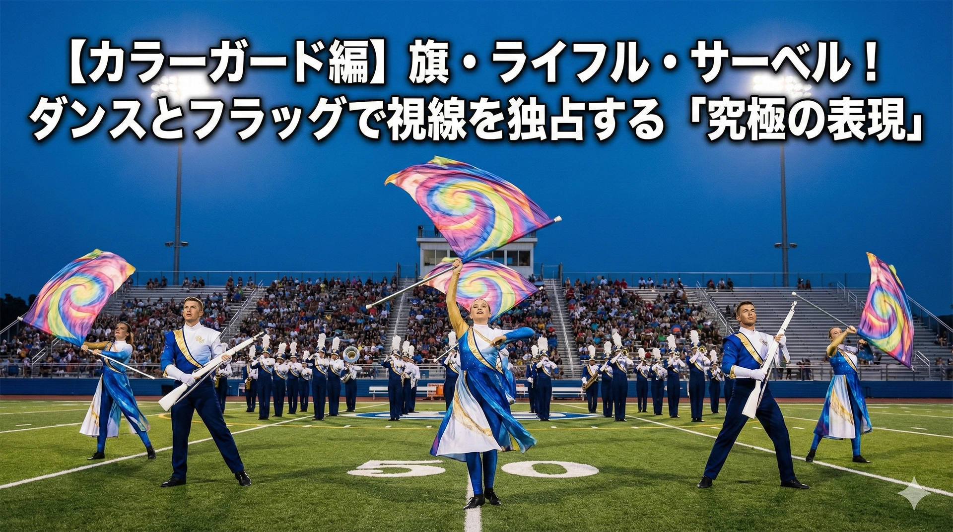 今回は、マーチングバンドの中でもひときわ華やかで、観客の視線を一瞬で奪っていく花形パート「カラーガード(Color Guard)」について、ガッツリ語っていきたいと思います!
